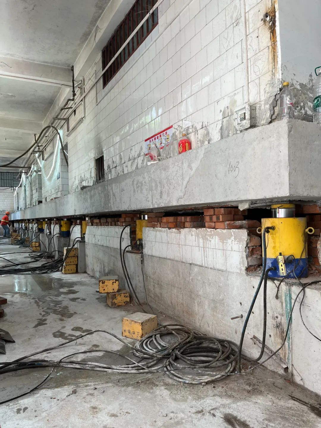该大楼建造于上世纪八十年代,总体分为东西两栋。西侧大楼结构类型为地上四层砖混结构,总高14.7m;东侧大楼为后建两层砖混结构,两栋大楼间设置有结构缝。经观测,该建筑基础沉降稳定。经检测该房屋倾斜超限且上部结构承载力不足,东西两侧大楼向北平均倾斜率分别为12.60‰、16.72‰。腾博官网项目团队根据检测报告,制定了精密的纠偏方案,精准计算顶升点位与力度,最终将建筑抬升至设计标高,偏差控制在毫米级。